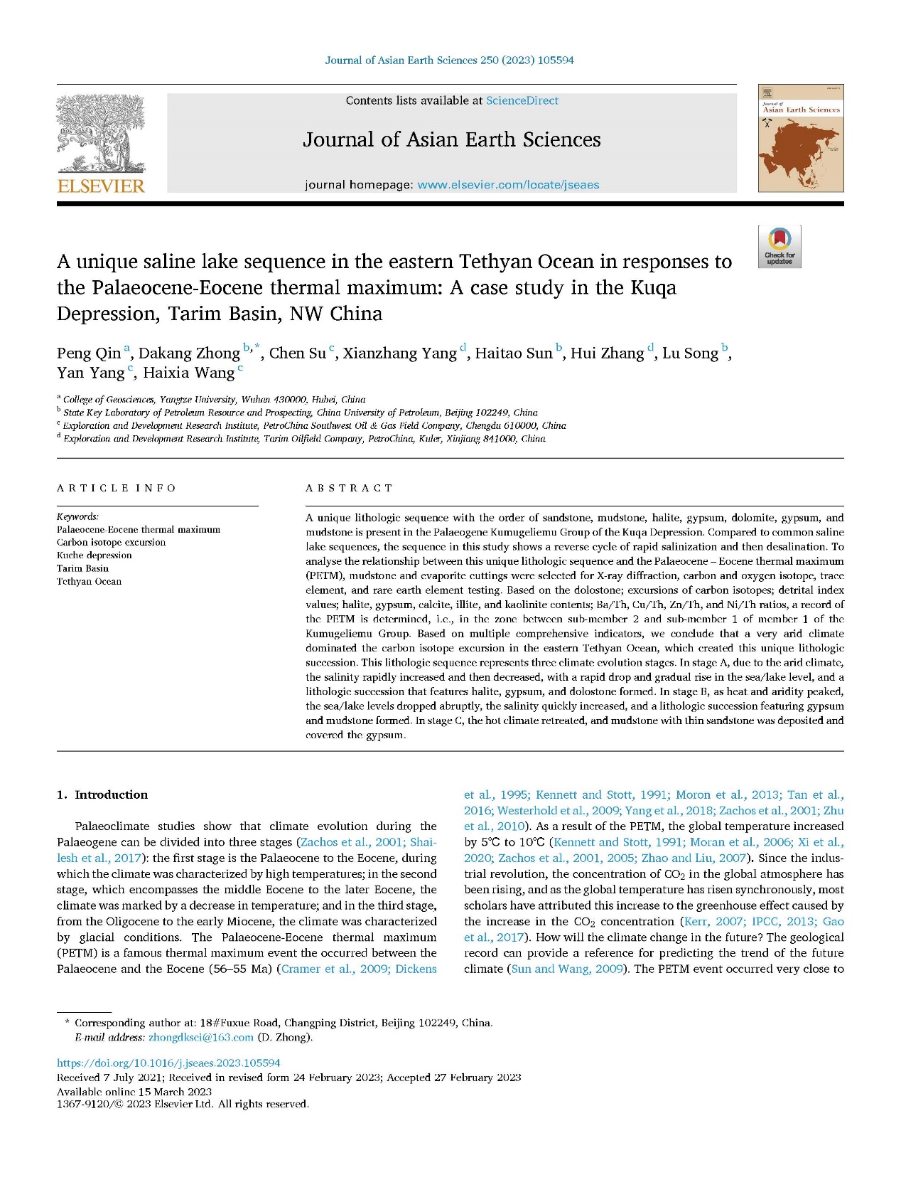 日本无码av 秦鹏博士以第一作者的身份在Journal of Asian Earth Sciences上发表题目为《A Unique saline lake sequence in the eastern Tethyan Ocean in Responses to the Palaeocene – Eocene Thermal maximum: A Case Study in the Kuqa Depression, Tarim Basin, NW China》的论文。