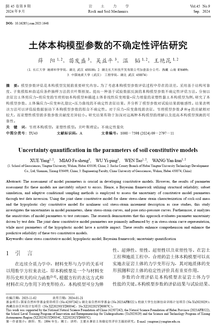 地质系教师薛阳博士以第一作者身份在《岩土力学》上发表论文。《岩土力学》为中国核心、EI收录期刊;2019年,《岩土力学》入选中国科技期刊卓越行动计划梯队期刊;2023年中国岩石力学与工程领域唯一入选ESCI的中文期刊,获得第一个JCR影响因子1.5;JCR分区Q3(信息来源官网)。本项研究得到了国家自然科学基金项目和西藏自治区科技项目的资助。