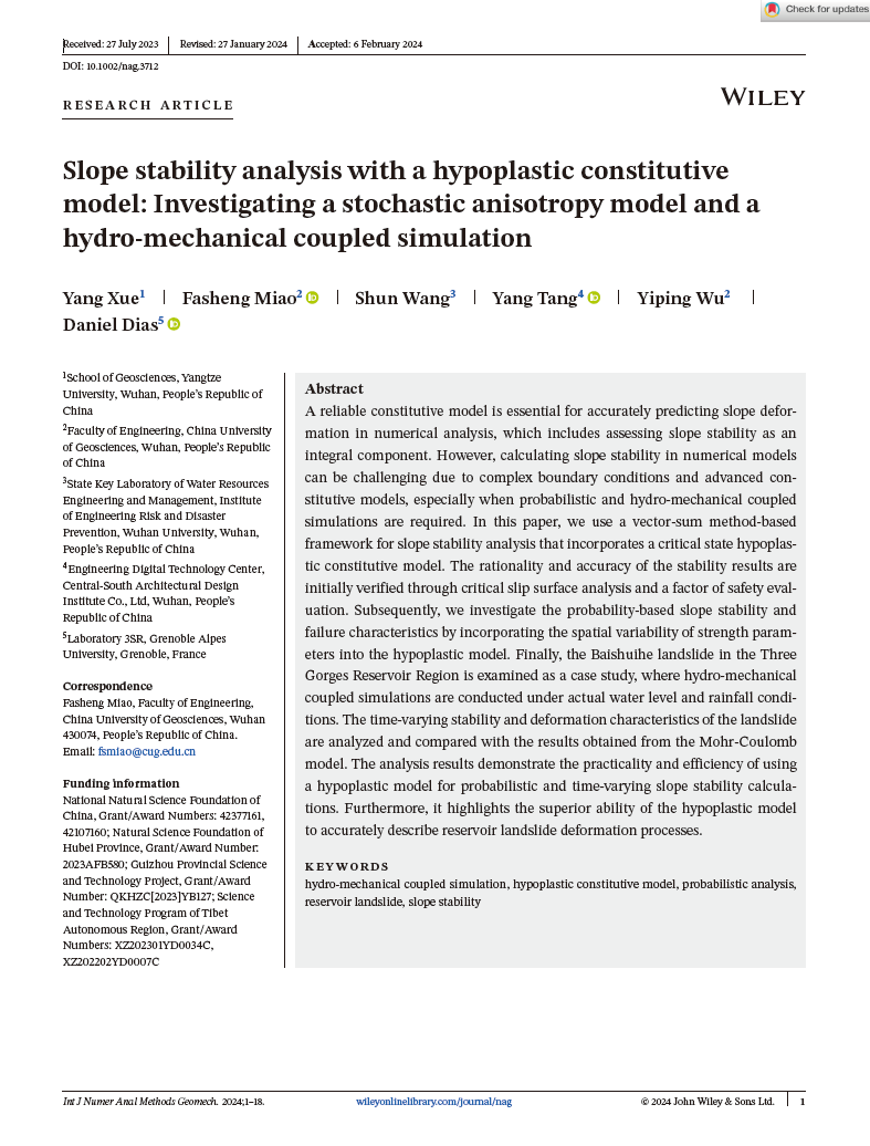 日本无码av 地质系教师薛阳博士以第一作者身份在计算机岩土领域老牌期刊《International Journal for Numerical and Analytical Methods in Geomechanics》上发表题为“Slope stability analysis with a hypoplastic constitutive model: investigating a stochastic anisotropy model and a hydro-mechanical coupled simulation”的论文。本项研究得到了国家自然科学基金项目和西藏自治区科技项目的资助。