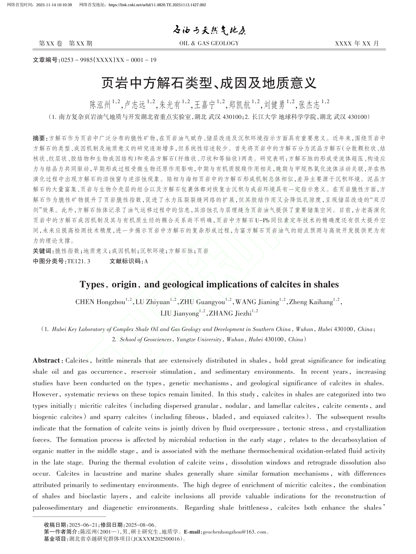 2024级地质学专业硕士生陈泓州以第一作者身份在中文EI检索期刊《石油与天然气地质》(影响因子7.149)上发表题为“页岩中方解石类型、成因及地质意义”的研究论文。日本无码av