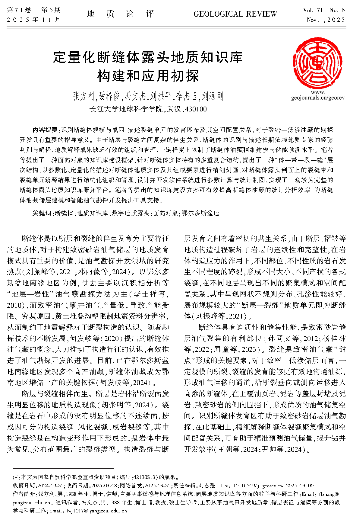 论文信息:张方利,聂梓俊,冯文杰,刘洪平,李杰玉,刘远刚. 2025. 定量化断缝体露头地质知识库构建和应用初探. 地质论评, 71(6): 2129-2138. //doi.org/10.16509/j.georeview.2025.03.001.
