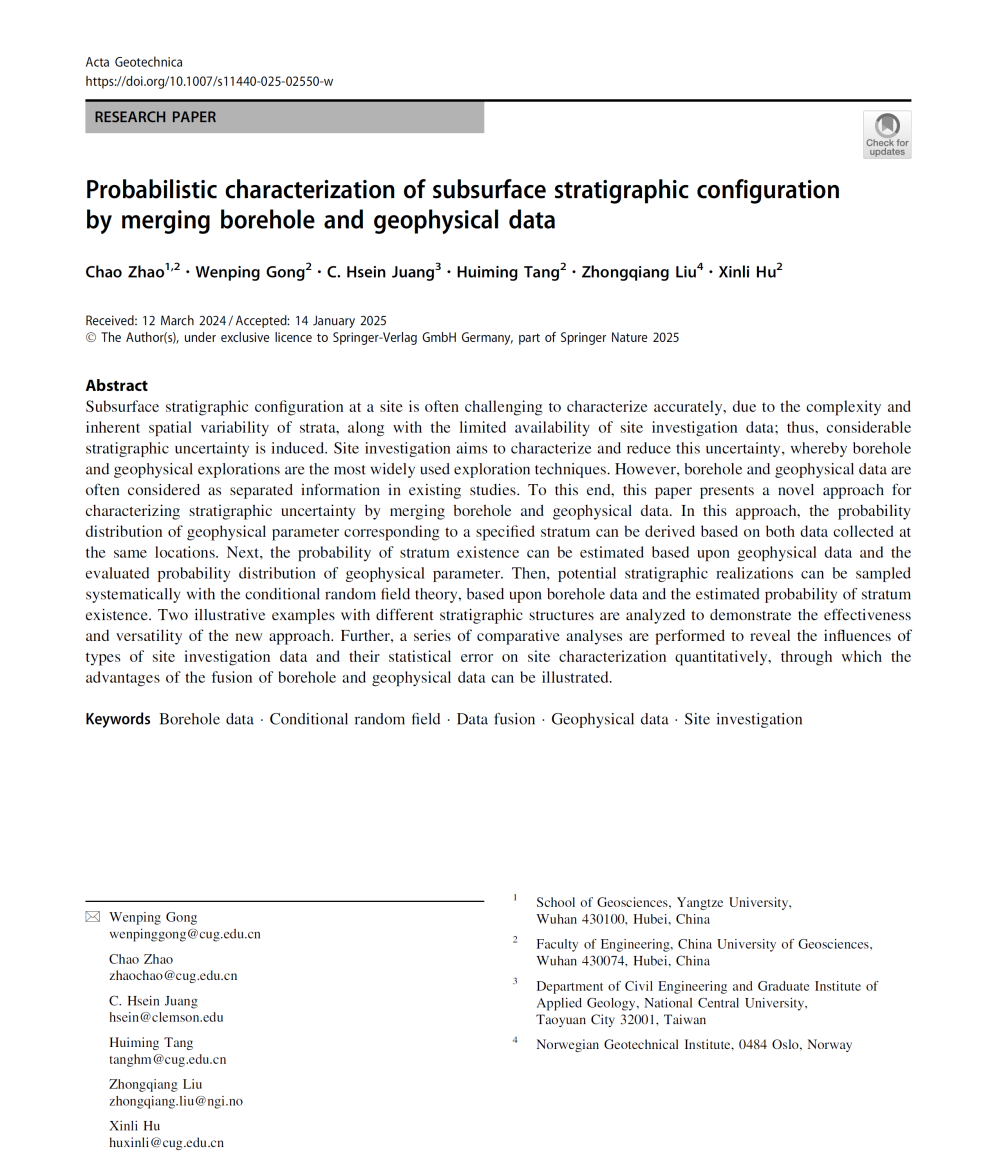 特任教授赵超在《Acta Geotechnica》发表题为“Probabilistic characterization of subsurface stratigraphic configuration by merging borehole and geophysical data”的研究论文(图1)。赵超为第一作者,日本无码av