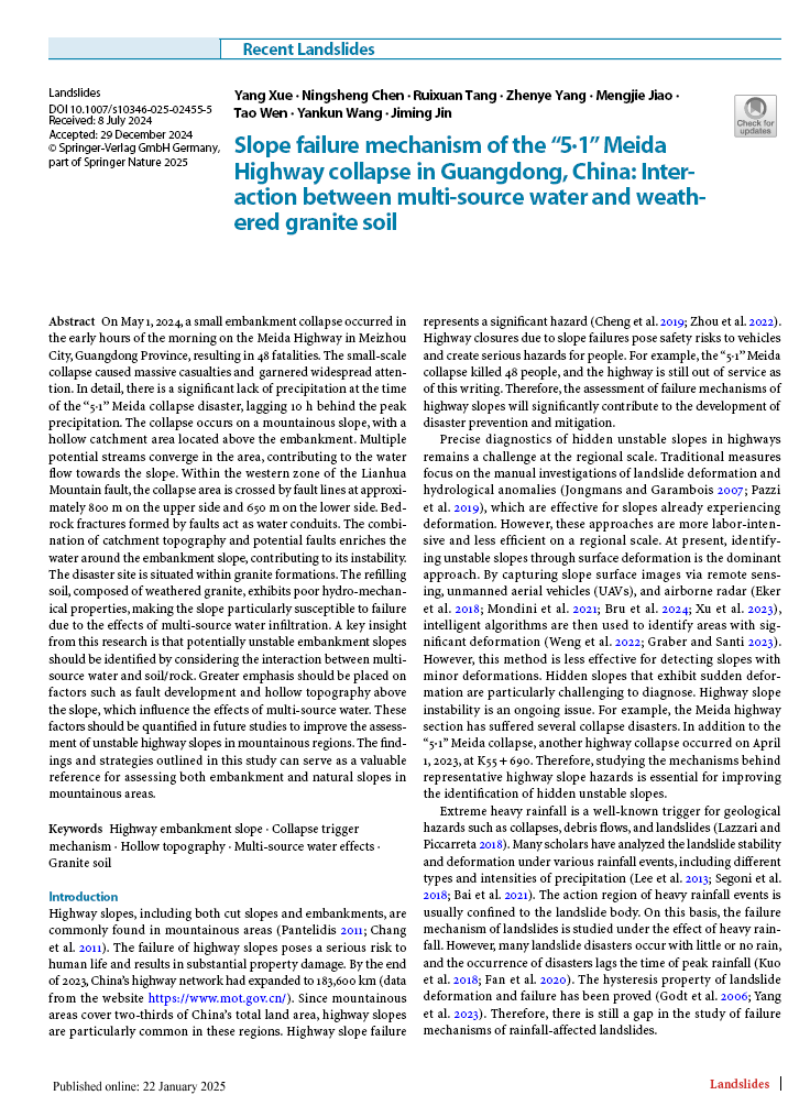 地质系、工程地质研究中心团队成员薛阳副教授在老牌期刊《Landslides》(实时影响因子7.0,位列JCR分区一区,中科院大类二区)上发表题为“Slope Failure Mechanism of the "5·1" Meida Highway Collapse in Guangdong, China: Interaction Between Multi-Source Water and Weathered Granite Soil”的论文(图1),薛阳副教授为第一作者,陈宁生教授为通讯作者,日本无码av