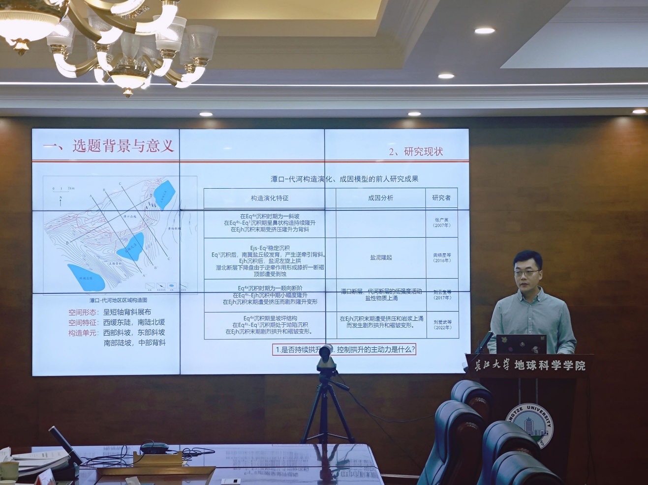 杨浩的学位论文题为《潭口-代河走滑构造演化特征及形成机理》,在导师李涛副教授的指导下,论文以自江汉盆地潜江凹陷潭口-代河段为研究对象,通过基于构造应变的剥蚀量恢复方法恢复了研究区剥蚀地层,并通过平衡剖面法完成了研究区4条代表性剖面的构造演化工作,并对潜江组-荆河镇组沉积时期的构造活动强度进行了评价。论文认为,根据潜北断层走向变化情况,潭口-代河构造在潜北断层走滑增压段,相邻蚌湖凹陷和三合场次洼处于潜北断层走滑释压段。在江汉盆地同一的伸展应力环境下,潭口-代河段的伸展应力强度低于两侧的蚌湖凹陷和三合场次洼,从而在潭口-代河段形成被动隆起。在荆河镇组沉积末期,随着区域应力场的转变,该区受挤压隆升,遭受剥蚀,而后又沉降,沉积广华寺组合平原组,形成现今形态。论文认为,潜北断层的走滑强度从潜4下段-荆河镇组沉积期,强度持续减弱。