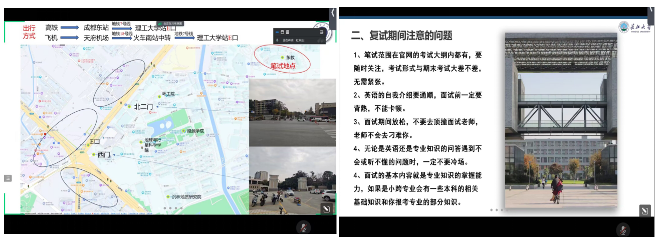 来自成都理工大学的杜安业同学介绍学校周边环境出行方式酒店预订等方面大家温馨提示,特意收集考取其他学院的校友联系方式,方便同学们进行更有针对性的联系。去年成功调剂到昆明理工大学的王毅博为大家分享自己调剂经验以及如何拓展调剂信息的搜集渠道、复试时需要注意的问题和面试技巧等。杨肖利同学中国石油大学(华东)研究生复试环节科目内容为大家进行深入浅出讲解,重点强调了保持心态的重要性鼓励大家自信避免焦虑紧张