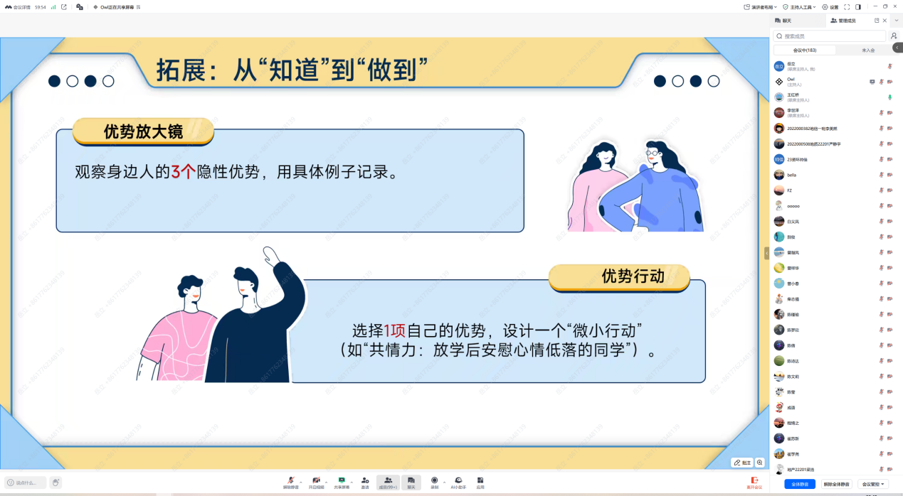 (通讯员 郝兴瀚)为筑牢校园心理防线,5月22日、23日晚,日本无码av 心理专干王红桥老师在13教B122主讲“认识自己,悦纳自己”心理健康培训,2024级141名学生骨干现场参与,线上本、研究生各年级累计452人通过腾讯会议同步学习。 王红桥老师从生理自我、心理自我、社会自我三个维度展开对自我认知的讲解,并分享增强自我认同的两个自我探索的方法:“20个我是谁”、“每日优点记录”,她还介绍了“优势卡牌”,引导同学们通过与他人的互动发现潜在优势。结合大学生心理困惑案例,王老师带领同学们剖析自我认知偏差的成因与表现,深化了大家对自我认知的理解。对于如何悦纳自己的缺点与不足,王老师用具体生活事例说明不同特质在学习、生活和职业发展中的作用,并分享“优势探索表”,指导大家转换对缺点的看法和评价,提升心理健康水平。 此外,王老师强调了学生骨干在校园心理健康工作中的重要作用,邀请大家履行职责,以身作则做示范、宣传知识、关注同学动态并及时反馈、推荐有需要的同学寻求专业帮助。培训最后还介绍了心理中心的服务项目与学校四级心理危机干预体系的运作机制,呼吁大家积极参与心理健康教育,共筑校园心理防护网。 (审核 冯舒 编辑 王红桥)