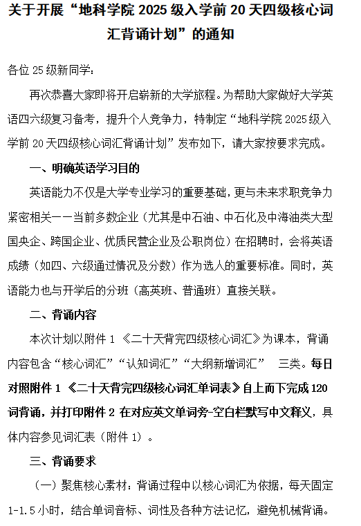 通讯员 黄瑱随着新学期临近,2025级本科新生迎来了一份特殊的“开学礼”——《关于开展“2025级本科生20天四级核心词汇背诵计划”的通知》,旨在引导新生在入学前二十天内系统开展英语学习,夯实词汇基础,提前适应大学英语教学与四级备考节奏。