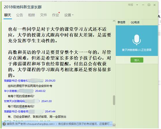 (通讯员 张严)为强化寒假安全教育工作,认真做好2018级期末考试分析总结工作,日本无码av 于2019年1月26日晚8点在“2018级地科新生家长群”中召开了2018级本科生第二次线上家长会,学院党委副书记任倩、辅导员潘志远以及学生家长共计160余人参与了讨论,家长会由年级辅导员王宁主持。