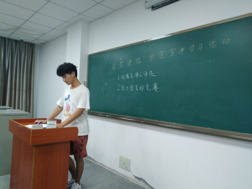 组织部部长上台进行示范宣讲。他讲道:“此次‘百生讲坛’活动,我们会进行优秀主讲人评选活动和活力团支部竞赛。”他希望同学们能踊跃报名参加,为宣传贯彻习近平新时代中国特色社会主义思想和党的十九大精神“四进四信”做出自己的贡献。