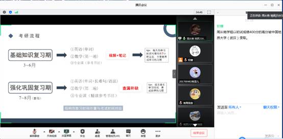 6月12日晚7点半,地质21601班周从艳同学、地质21602班黄东谋同学和地质21603班金澳涵同学给2017级地质专业开展线上考研经验交流,他们分别以优异的成绩被中国地质大学(武汉)、中国石油大学(华东)和中国地质大学(武汉)录取为硕士研究生。周从艳同学就考研前期、基础知识复习期、强化巩固复习期、攻坚复习期和冲刺模考复习期五个考研复习阶段进行了详细解读,给同学们传授了正确的考研复习指导计划;黄东谋同学主要强调了寻找考研复习伙伴的重要性,他说道“有一个志同道合的小伙伴,不仅能在漫长又孤单的复习道路上给与自己心灵的陪伴,同时也能在遇到学习困难时共同讨论解决办法,帮助自己巩固知识体系”。金澳涵同学分学科给同学们讲解了自己的考研复习经验。谈到对英语的学习,他认为既要注重单词,又要注重解题技巧;政治主要就是背,也要对时事新闻有所了解;说到数学,他提醒同学们要巩固基础,一定要勤加练习。对于专业课,他强调要把知识学活,注重理解。
