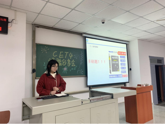 大会伊始,郭老师对4月8日组织的第一次四级模考情况进行了通报,指出了同学们普遍存在的问题,并且再次向大家阐述了四级证书的重要性。随后,郭老师向同学们具体介绍了学院为大家精心制定的“助力四级 成就梦想”系列活动安排,倡议以班为单位建立学习小组,分班制定学习计划并落实。她鼓励同学们珍惜每次学习机会,用“坚持”与“高效”备战英语四级。