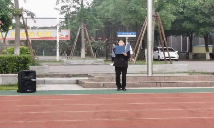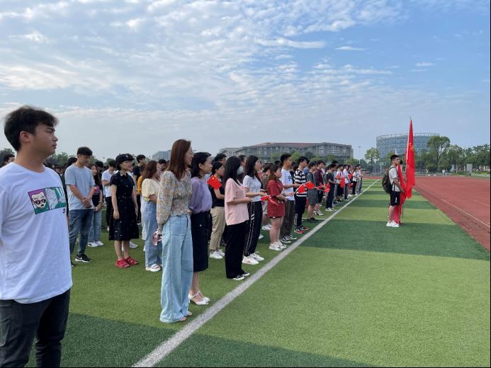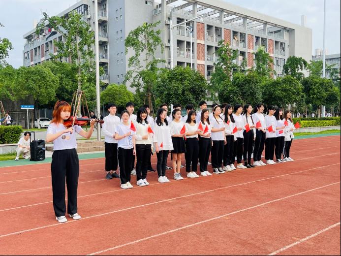 升旗仪式开始前,全体师生进行“唱红歌”环节。在资工22004班和院学生会同学们的带领下,全体同学满怀热情,先后齐唱了《国家》和《闪闪的红星》,两首歌曲,嘹亮的歌声响彻整个操场。