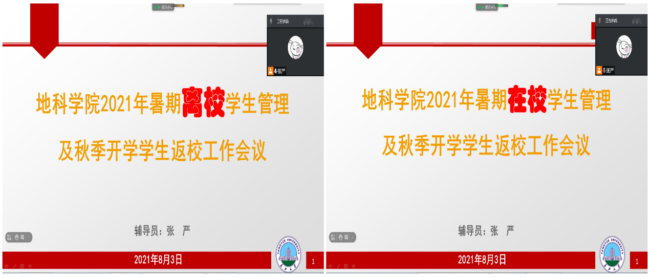各年级辅导员按“校内”与“校外”两类学生分组组织召开主题班会。会议内容主要包括暑假学生管理和秋季开学返校安排两方面,重点介绍了当前愈发严重的疫情防控形势,要求同学们在暑假期间保持信息的畅通、明确学校的相关要求、非必要不外出并出现问题及时报告,最后要求积极注射疫苗;接下来对返校的6个步骤逐一进行讲解,特别是对“打卡”和“申请”环节的“每天坚持打卡、提交行程绿码和健康绿码、填写返校行程”等重难点工作进行了仔细说明。