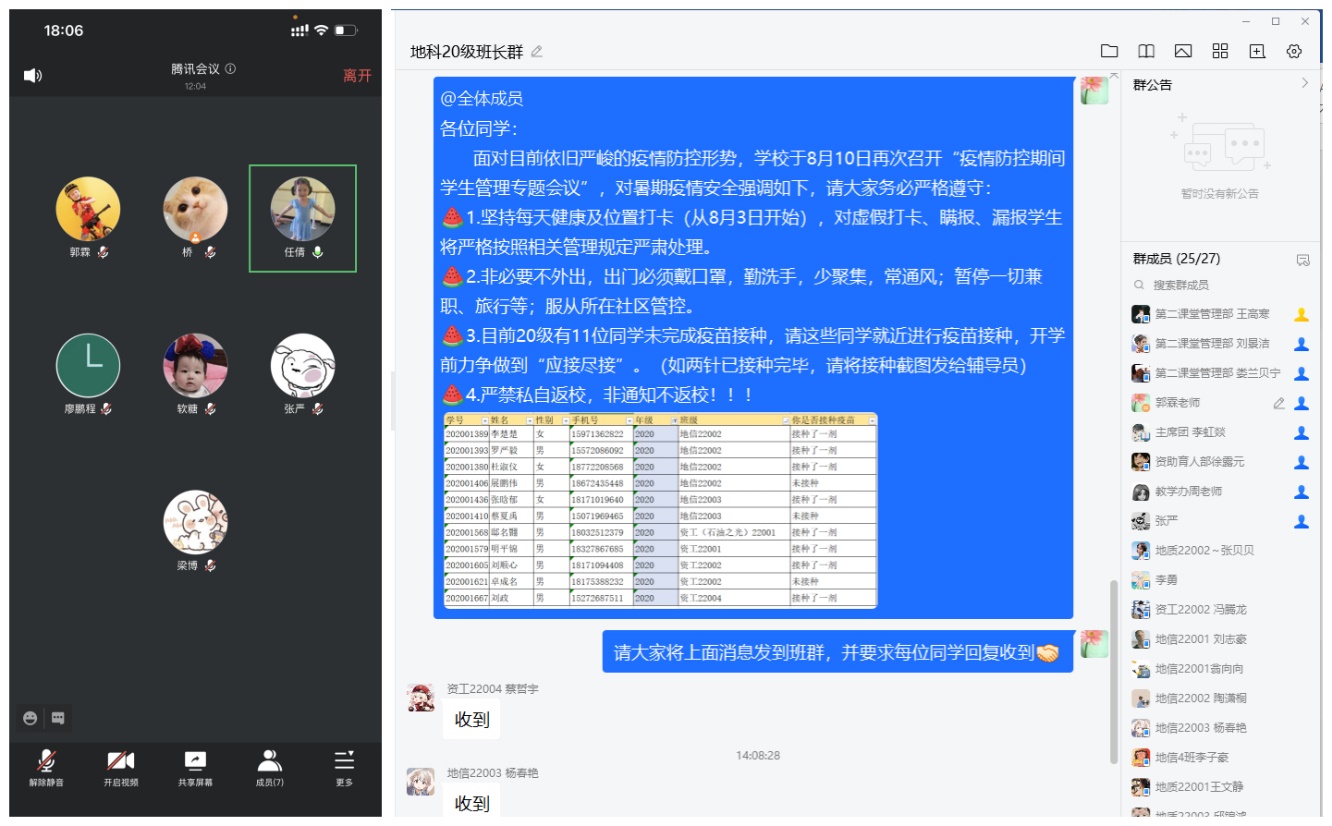 8月11日,各年级辅导员用腾讯会议组织召开主题班会。会议首先向全体同学强调了国内目前疫情动态,带领同学们再次学习了荆州市、武汉市、学校多层次的疫情防控政策,并向同学们强调要无论身在何方,一定要遵守当地防控规定。其次,分留校学生和校外学生两类群体,向大家梳理并强调了防控细则,主要包括坚持并诚信开展每日健康打卡;非必要不外出,严禁私自离校与返校,如要离校与返校必须提前提出申请;未完成疫苗接种的同学,要就近进行疫苗接种,做到“应接尽接”;出现发热、乏力、咳嗽等症状,应第一时间通知社区及辅导员;对处于中高险学生和健康码、行程码出现异常情况学生,“一对一”了解行程,并跟踪做好疏导、安抚、资助工作等。