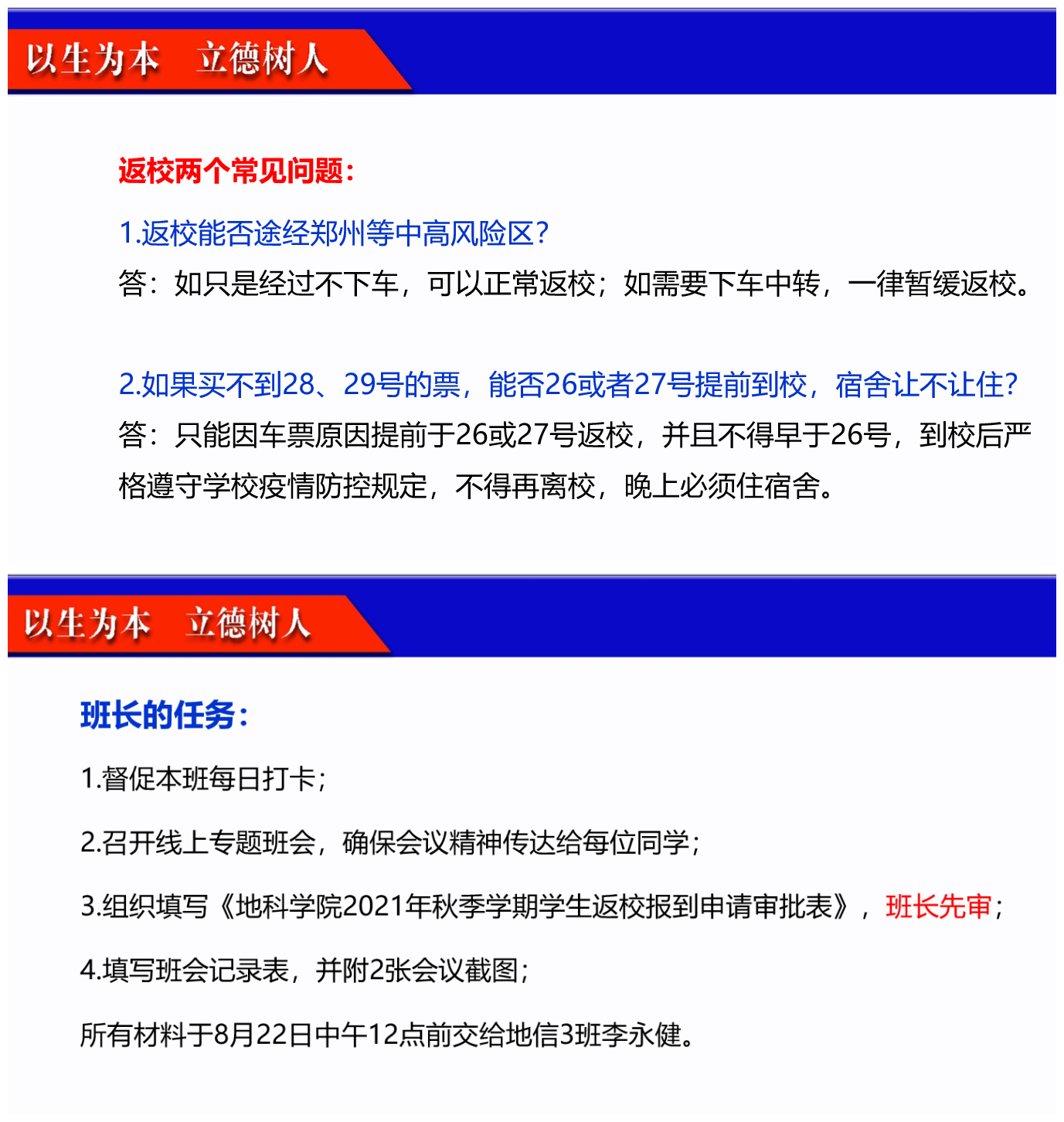 主题班会由各年级辅导员负责,并分两步进行。第一步先由各辅导员组织召开班长及安全员会议,会议主要从返校流程要求、常见问题、疫苗接种、日常防护等方面展开。重点强调了要严格遵守学校的疫情防控及开学返校工作要求,不得私自返校;同时要求坚持每天打卡,非必要不出门,保证自己的健康绿码和行程绿码,积极接种疫苗。第二步由各班班长组织召开班级会议,确保学校及学院疫情防控及返校工作精神无一遗漏传达给每位同学,并组织同学们填写返校申请审批表。