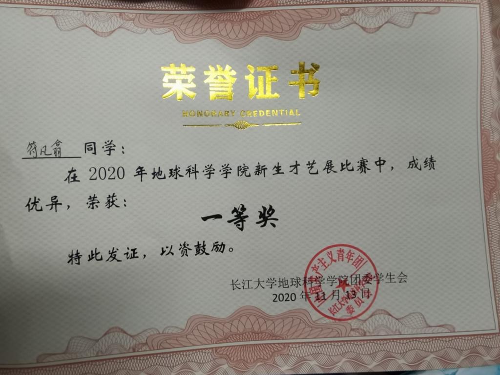 符凡翕:入党积极分子,2020学年担任班级宣传委员,2021学年起担任地信22002班级学委,曾在过校会院会多个组织任职,参加过多次校级文艺汇演,获得过一等奖(如图3),该同学能努力的按照一名共产党员标准严格要求自己,向党组织靠拢,积极表现,认真学习党的先进思想理论与方针政策,用理论指导实践。