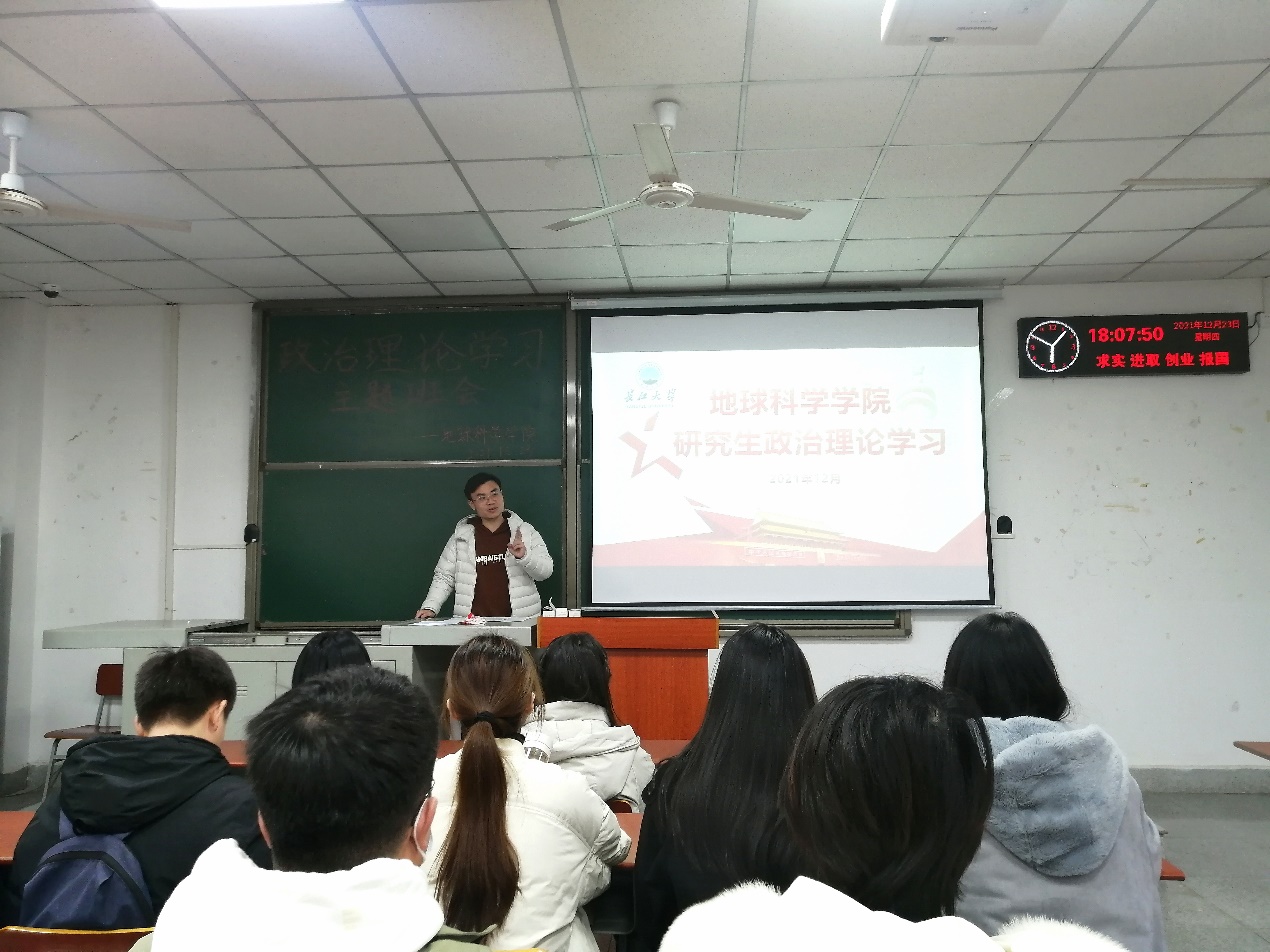 (通讯员 古楠玲)不忘初心,牢记使命。日本无码av 积极响应政治理论学习活动的号召,从12月11日至12月30日,开展了以班为单位组织学习,线上、线下相结合的政治理论学习活动,并于12月23日晚,在B-202教室集中进行了线下政治理论学习活动。此次学习由日本无码av 学工办兼职辅导员梁博主讲,研究生会主席陈剑峰主持,全体研究生参加。