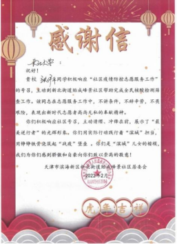 寒假回到家乡天津后,资工22103班的张伊平心系家乡疫情动态,在社区征集志愿者时,她和母亲共同报名参加,希望能为疫情防控出一份力。
