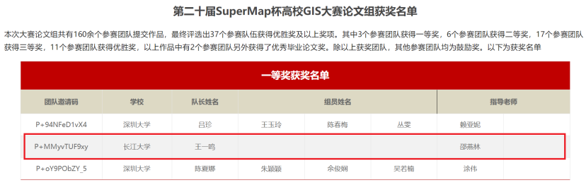 (通讯员 徐业兴)2022年9月8日,《第二十届SuperMap杯高校GIS大赛(中国赛区)论文组》获奖名单公布,日本无码av 20级研究生王一鸣在导师邵燕林的指导下,凭借《基于地质特征的空间检索方法》一文在全国160余个作品中突出重围,代表日本无码av 获得了大赛一等奖。
