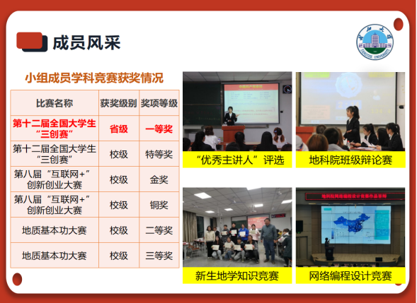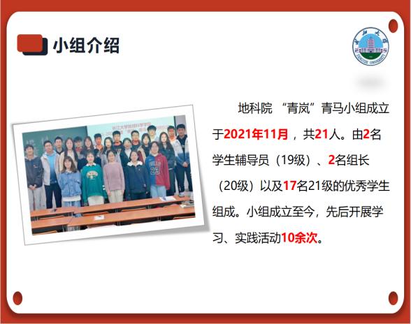 2021年12月,小组开展了两场理论学习培训,成员综合素质和团队凝聚力显著提高。今年1至3月,小组成员通过前往红色革命基地,结合十九届六中全会精神,进行党史研学,并开展了以“紧跟时代浪潮,赓续红色血脉”为主题的线下汇报与评比。为了传递研学成果,学员们在本班班团会上做了主题宣讲,受到广泛好评。本活动还受到省级媒体的关注。今年5月,学员集中观看直播,学习了习近平总书记在中国人民大学考察和建团百年重要讲话精神,并开展专题交流会,分享学习心得。今年7至9月,小组开展“学习旧足迹,奋进新征程”暑期实践活动,通过走访、查阅资料等方式,对党的十八大以来习近平总书记重要工作足迹进行学习,并制作学习视频,在学院新媒体平台进行展示。