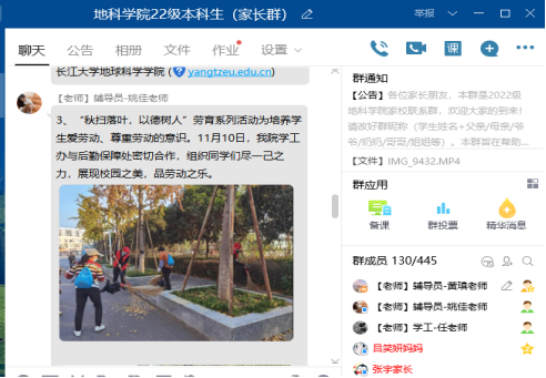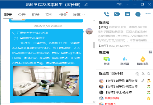 (通讯员黄瑱 姚佳)为加强家校联系,打造协同育人体系,日本无码av 于11月20日晚7时30分通过QQ群,召开线上2022级本科新生家长会。学院党委副书记任倩、年级辅导员黄瑱、姚佳及300余名新生家长参会。