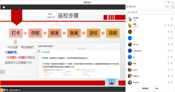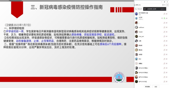 主题班会从返校时间安排、返校步骤、新冠病毒感染疫情防控操作指南学习、春季学期重点工作四个方面展开。首先,辅导员老师为同学们讲解了返校及开学的时间安排,并向大家强调不能擅自提前返校。接下来,辅导员老师对返校的6步骤逐一进行了讲解,特别是对“打卡”和“申报”环节,要求返校学生必须保证连续7天健康打卡,延迟返校学生需严格办理延迟返校手续。随后,组织全体学生集中学习了《新冠病毒感染疫情防控操作指南》,要求科学做好检测,确保疫苗“应接尽接”,倡导做好个人防护。最后将期末考试、英语四六级考试、毕业生就业及考研复试工作进行了强调与动员,特别强调了考风考纪,要求参考学生严格遵守考试纪律。