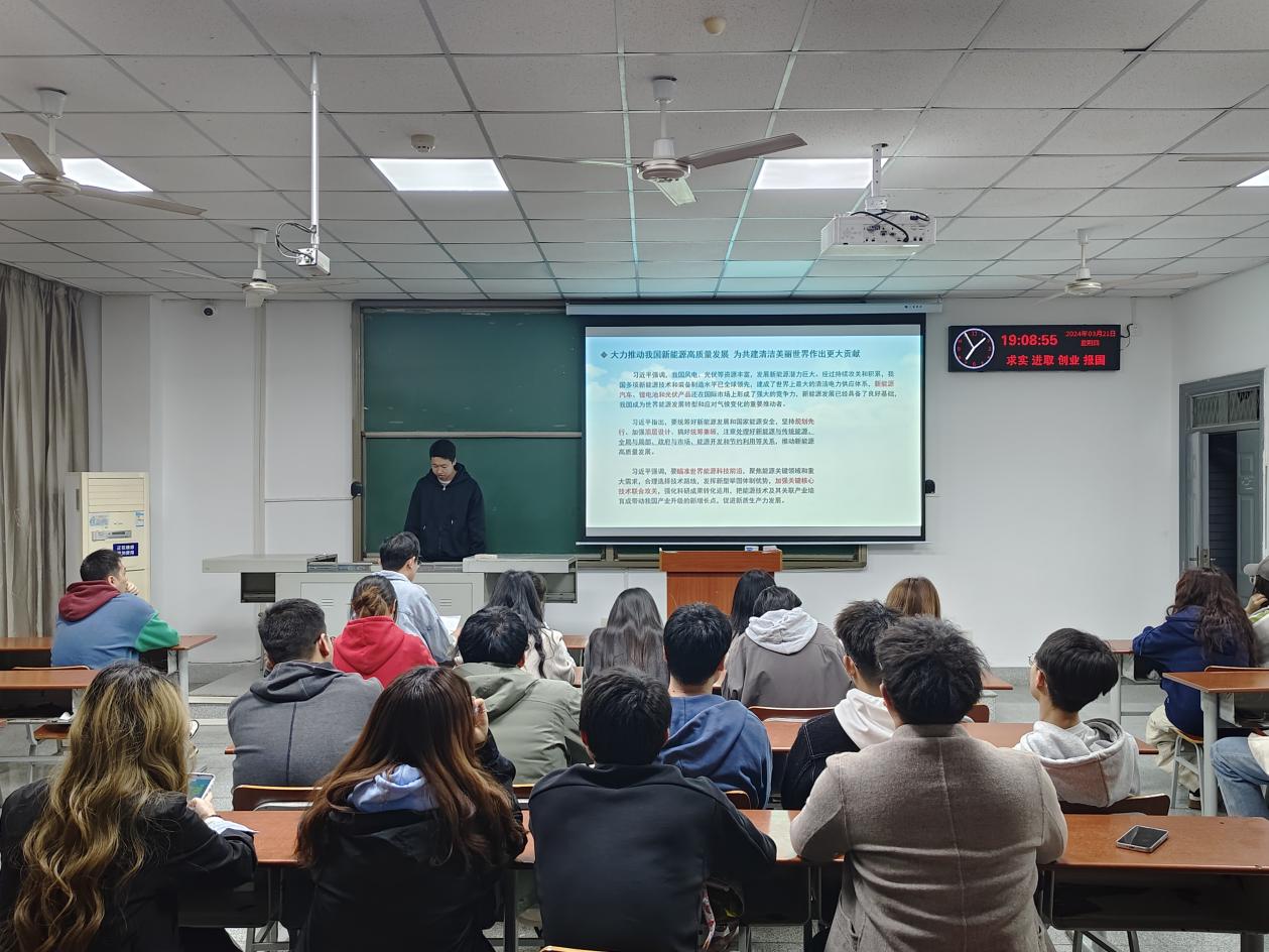 随后,穆浪同学做代表发言,他提到,我们应牢记习近平总书记强调的“能源安全事关经济社会发展全局,积极发展清洁能源,推动经济社会绿色低碳转型,已经成为国际社会应对全球气候变化的普遍共识。”。作为新时代青年,我们是高质量发展过程中的主力军,要顺势而为、乘势而上,为中国式现代化建设提供安全可靠的能源保障。