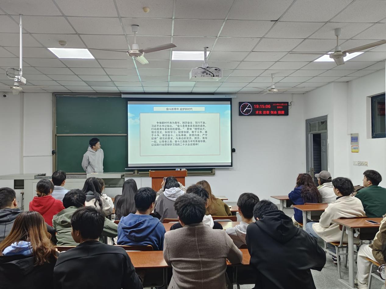 陈星兆同学在发言中提到,作为新一代奋斗青年,我们应牢记初心使命,顽强拼搏进取,奋力跑好历史的接力棒。 要以“理想远大、信念坚定,刻苦学习、锐意创新,敢于斗争、善于斗争,艰苦奋斗、无私奉献,崇德向善、严守纪律”要求自己,与身边的党员、团员、青年一起,以青春之我、奋斗之我奋力书写青春华章,以实际行动贯彻学习党的二十大会议精神。
