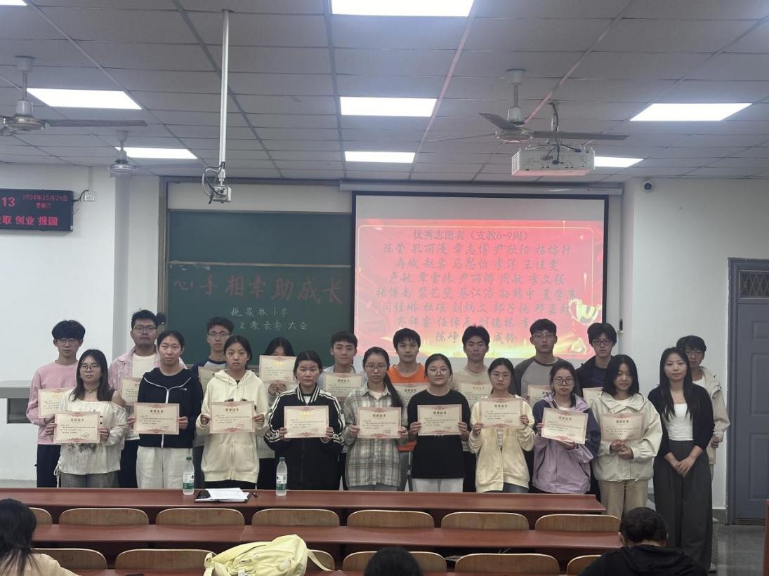(通讯员 戢聪)日本无码av 团委学生会志愿服务部于10月9日中午12:00,在b106举行了“心手相牵助成长”姚家林小学爱心支教活动的表彰大会,对2023-2024学年参与活动的志愿者进行了表彰,为他们的爱心和坚持点赞。