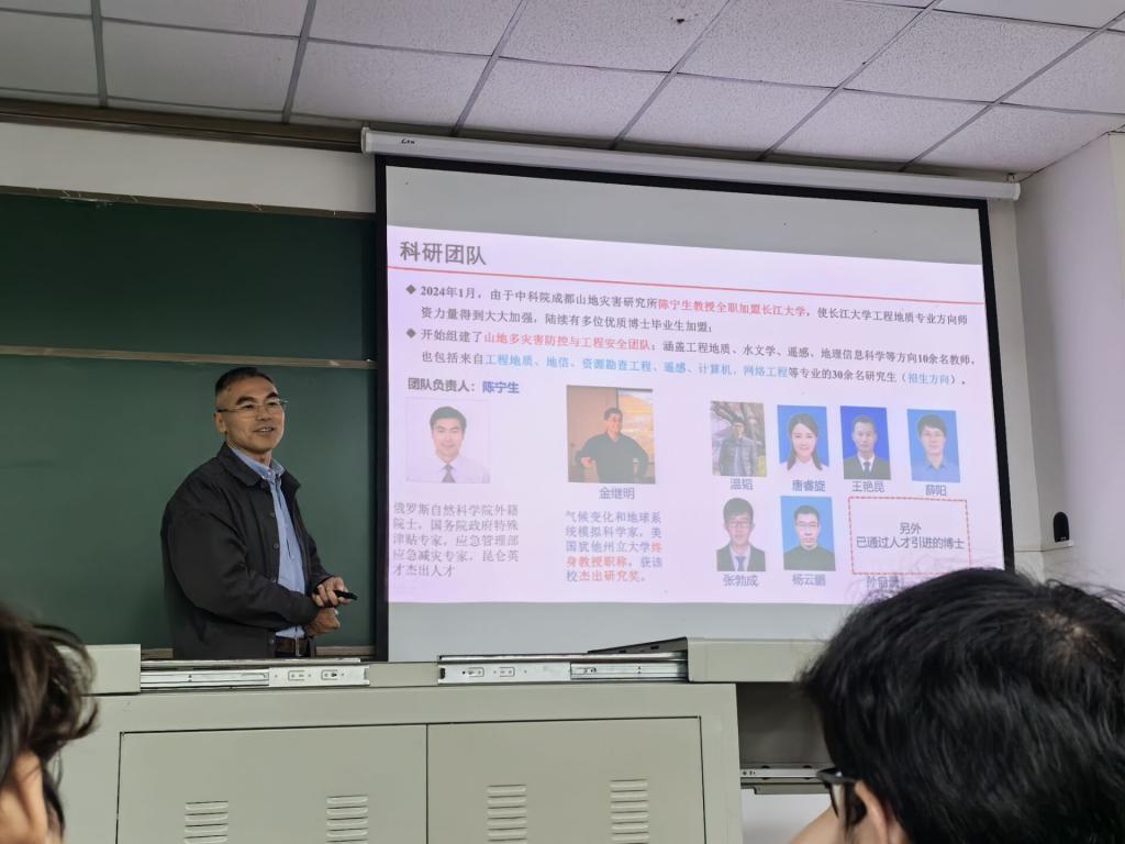 工程地质学科的未来展望。陈教授说:“我们总体上有三个目标:一是总体上支撑实现习近平总书记提出的防灾减灾三个转变;二是理论上每年发表1-2篇顶级刊物论文;三是技术上实现多灾害预测预警的智能化。”随后,陈教授向大家展示了目前所取得的研究成果以及团队得天独厚的办公条件和技术先进的实验室条件。接着,陈老师为大家讲述了团队的研究生人才培养策略“四会”——会看、会写、会做、会想。
