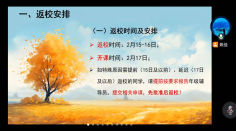 学院组织召开春季开学班主任和辅导员工作专题会议,传达学校关于新学期开学工作的具体要求,细化落实学生返校报到、教学安排、心理健康教育等重点工作,做好学生提前或延迟返校的学生沟通与服务保障工作,为新学期开好局、起好步奠定基础。各班级通过线上形式全覆盖召开返校安全教育主题班会。辅导员、班主任全程参与,重点向学生传达返校时间安排、报到流程、宿舍管理要求。