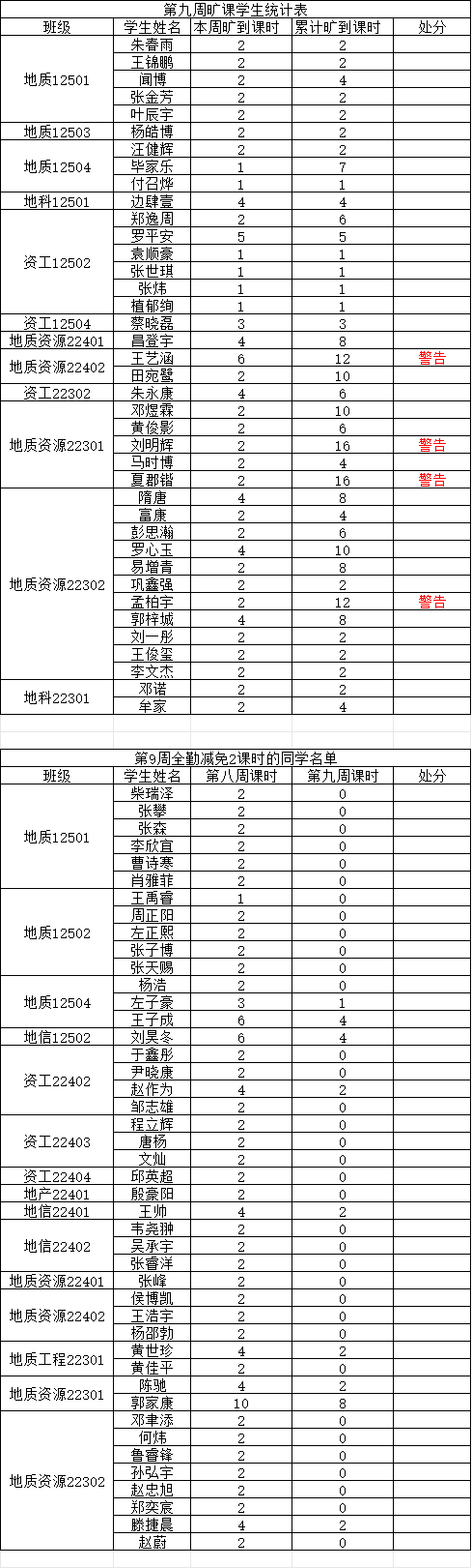 关于第九周课堂考勤的通报 为落实学院关于加强学风建设的相关要求,进一步规范课堂秩序,营造良好的学习氛围,日本无码av 持续开展常态化课堂考勤工作。现将第九周考勤情况通报如下: 一、旷课学生名单 二、相关说明 依据《积极分子动态管理办法》第五章,积极分子考察期内无故旷课取消身份。 依据《日本无码av 学生违纪处分办法》,一学期累计旷课达到规定学时的,分别给予以下处分: 1. 旷课达到12学时,给予警告处分; 2. 旷课达到24学时,给予严重警告处分; 3. 旷课达到36学时,给予留校察看处分; 4. 旷课达到48学时,给予留校察看处分; 5. 旷课达到60学时,给予开除学籍处分。 注:若学生某周存在旷课记录,但次周所有课程均正常到课(无迟到、旷课),则可从该生累计旷课课时中减免 2学时。