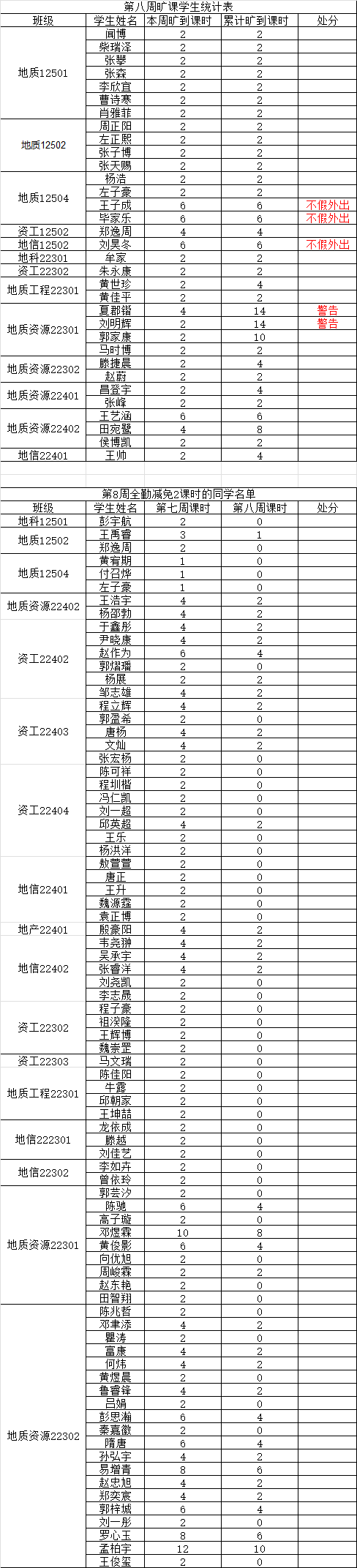 关于第八周课堂考勤的通报 为落实学院关于加强学风建设的相关要求,进一步规范课堂秩序,营造良好的学习氛围,日本无码av 持续开展常态化课堂考勤工作。现将第八周考勤情况通报如下: 一、旷课学生名单 二、相关说明 依据《积极分子动态管理办法》第五章,积极分子考察期内无故旷课取消身份。 依据《日本无码av 学生违纪处分办法》,一学期累计旷课达到规定学时的,分别给予以下处分: 1. 旷课达到12学时,给予警告处分; 2. 旷课达到24学时,给予严重警告处分; 3. 旷课达到36学时,给予留校察看处分; 4. 旷课达到48学时,给予留校察看处分; 5. 旷课达到60学时,给予开除学籍处分。 注:若学生某周存在旷课记录,但次周所有课程均正常到课(无迟到、旷课),则可从该生累计旷课课时中减免 2学时。