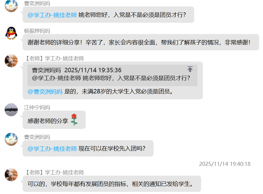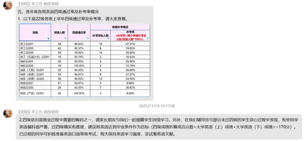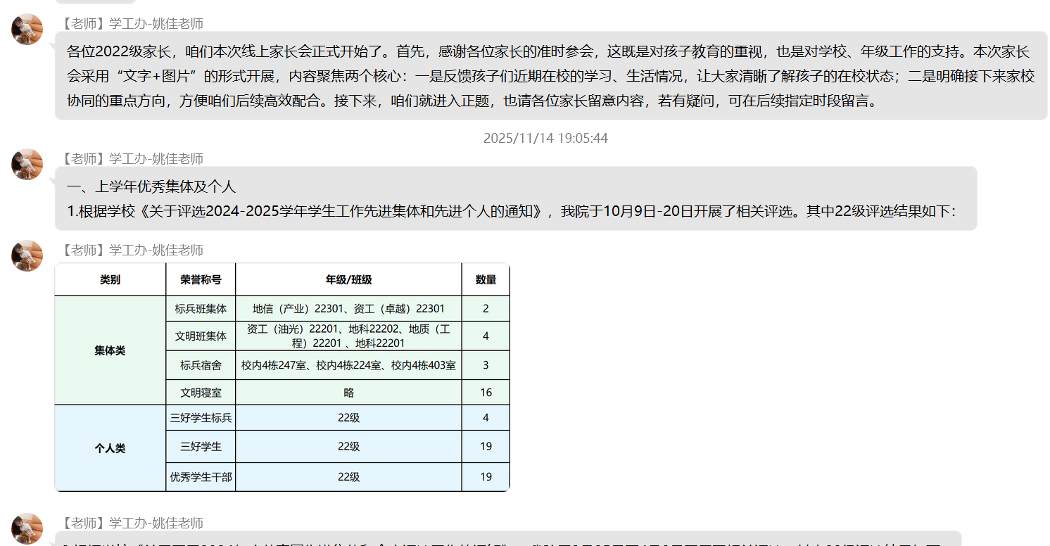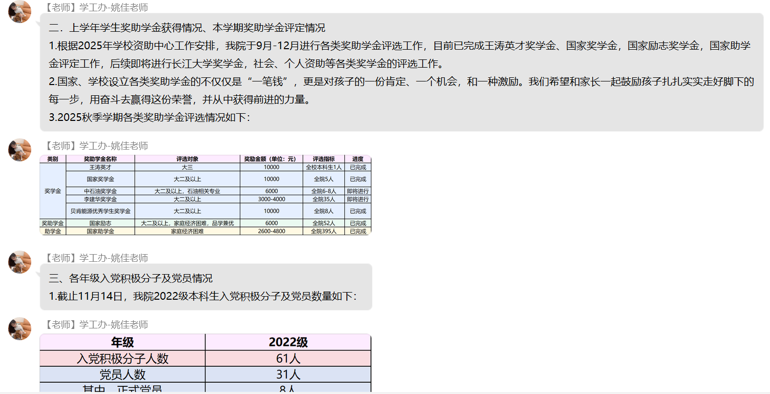 (通讯员 杨晟)为进一步加强家校沟通纽带,精准反馈学生在校动态,明确后续协同教育方向,11月17日晚七点,日本无码av 22级本科生线上家长会顺利召开。本次会议依托QQ群平台开展,采用“文字+图片”的组合呈现方式,确保信息传递直观高效,让全体家长全方位参与家校共育过程。 会议紧紧围绕“学情反馈”与“协同育人”两大核心展开,内容涵盖学生在校学习、生活、思想等多个关键维度,全面呈现学生成长面貌。在成果展示环节,学院详细通报了上学年优秀集体与个人的评选结果,清晰公示奖助学金发放情况,并同步说明本学期奖助学金的评定标准与进展,让家长直观了解学生的学业成就与荣誉获得情况。同时,会议还介绍了各年级入党积极分子及党员发展现状、科创类竞赛获奖成果,展现出学生在思想进步与创新实践中的积极风采。 学业与日常管理情况是本次家长会的重点内容。学院针对各年级各班英语四级通过率及补考率进行精准分析,结合课堂检查记录,客观反馈学生的课堂学习状态;通过宿舍检查结果与生活场景描述,让家长深入了解学生的住宿环境与集体生活表现。尤为重要的是,会议专门通报了各年级学业预警情况与心理重点关注对象动态,为家校协同做好学业帮扶和心理疏导提供明确指向。此外,学院还结合2022级学生的年级特点,详细解读当前考研备考进度与就业指导安排,为家长参与升学就业规划提供参考。 为巩固会议成效,学院在会后同步公布班主任、辅导员的多元沟通渠道,确保家长能随时反馈疑问、查询学生情况。针对家长集中提出的学业督促、心理关怀等问题,工作人员逐一耐心回应。同时,学院组织家长填写“家校协同育人”项目评价问卷,广泛收集对学校教育管理的意见建议。 此次家长会得到家长们的积极响应,有效凝聚了家校育人共识。下一步,日本无码av 将以家长反馈为参考,持续优化家校协同机制,为学生成长保驾护航。 (编辑 姚佳 审核 冯舒)