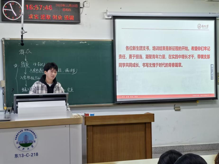 (通讯员 李宸宇/文 许芸菁/摄)为强化基层团组织建设,提升团干部履职能力,近日,学院2025级基层团干部培训会于东校区13教C218顺利举行。年级辅导员、2025级本科生团支书参加活动,兼职辅导员欧登波担任主讲。