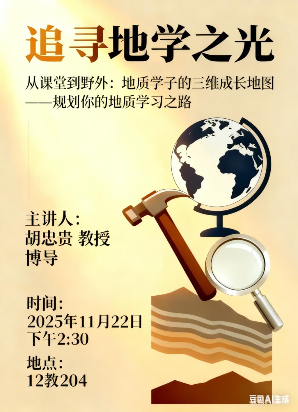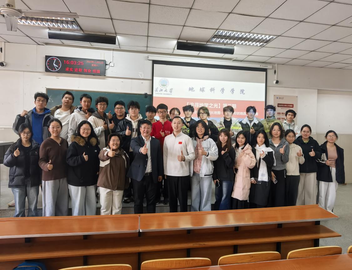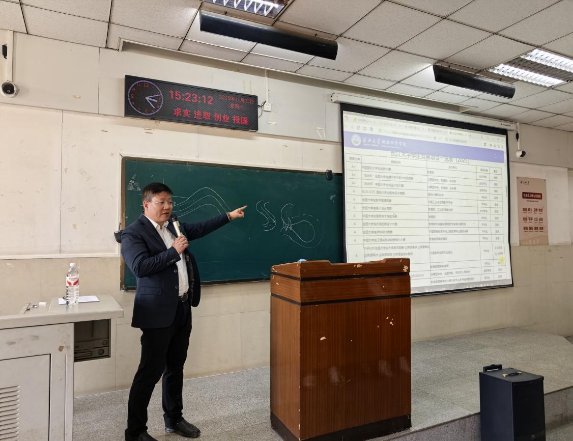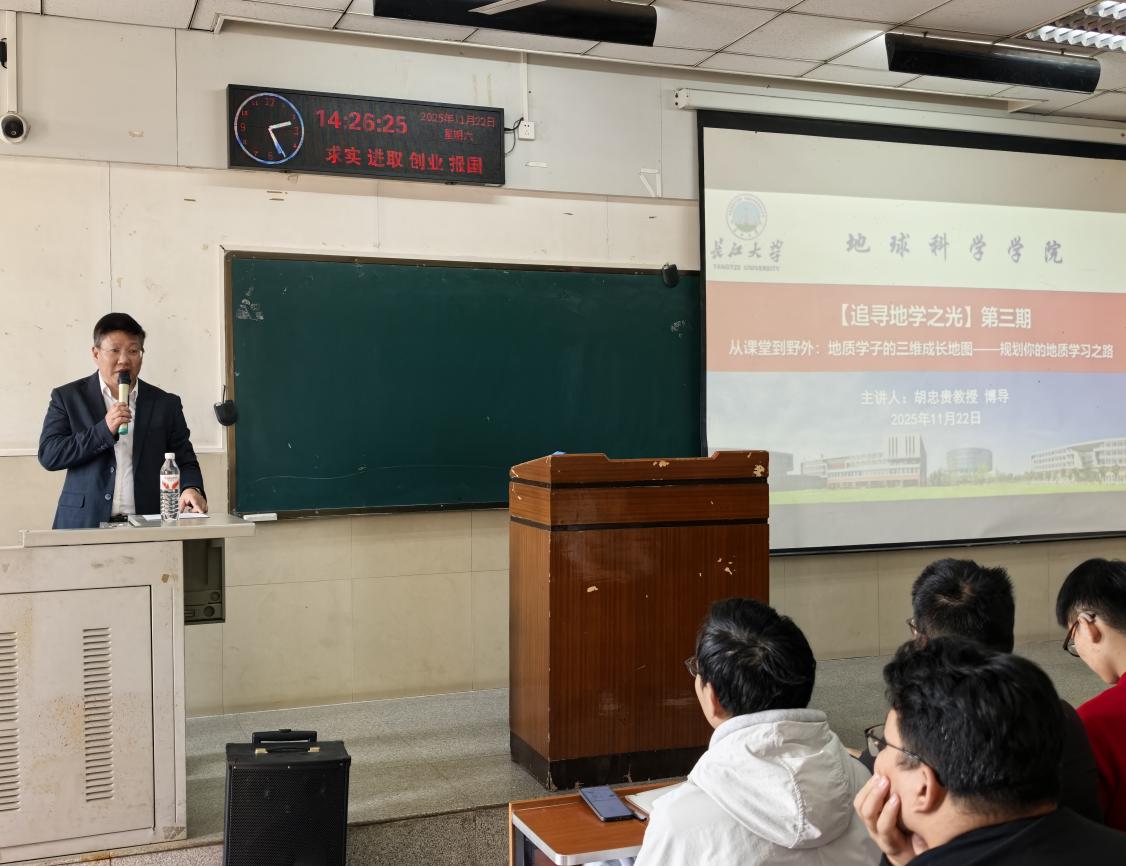 副院长胡忠贵老师做客第三期“追寻地学之光”,开展了题为《从课堂到野外:地质学子的三维成长地图——规划你的地质学习之路》的讲座。全体2025级地质系、地科系同学参加,活动由年级辅导员黄瑱主持。