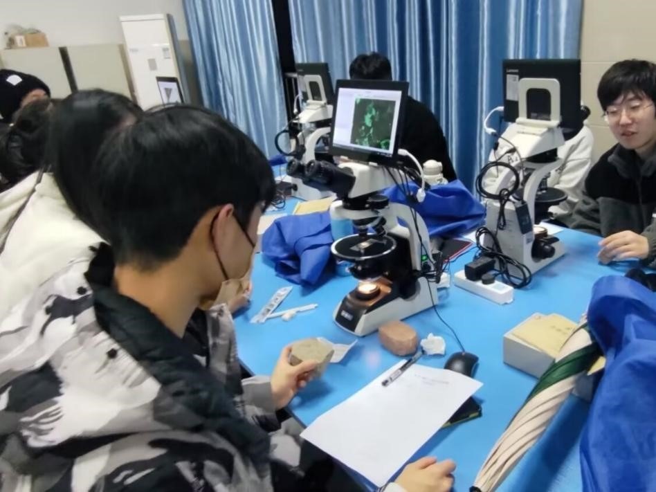 11月29日晚6点,同学们在实验楼A406举行了“地质标本鉴定”比赛。同学们分工合作,耐心细致地用显微镜观察常见岩石薄片和手表本,并对岩石各类属性进行积极讨论与分析,撰写实验报告,配合十分默契。最后大家以小队为单位,提交报告给评委老师进行评分。