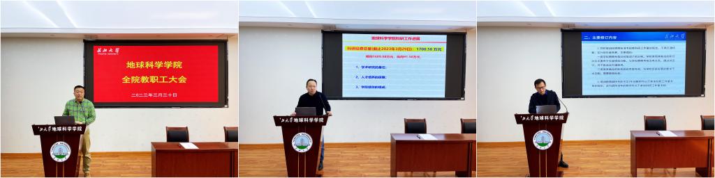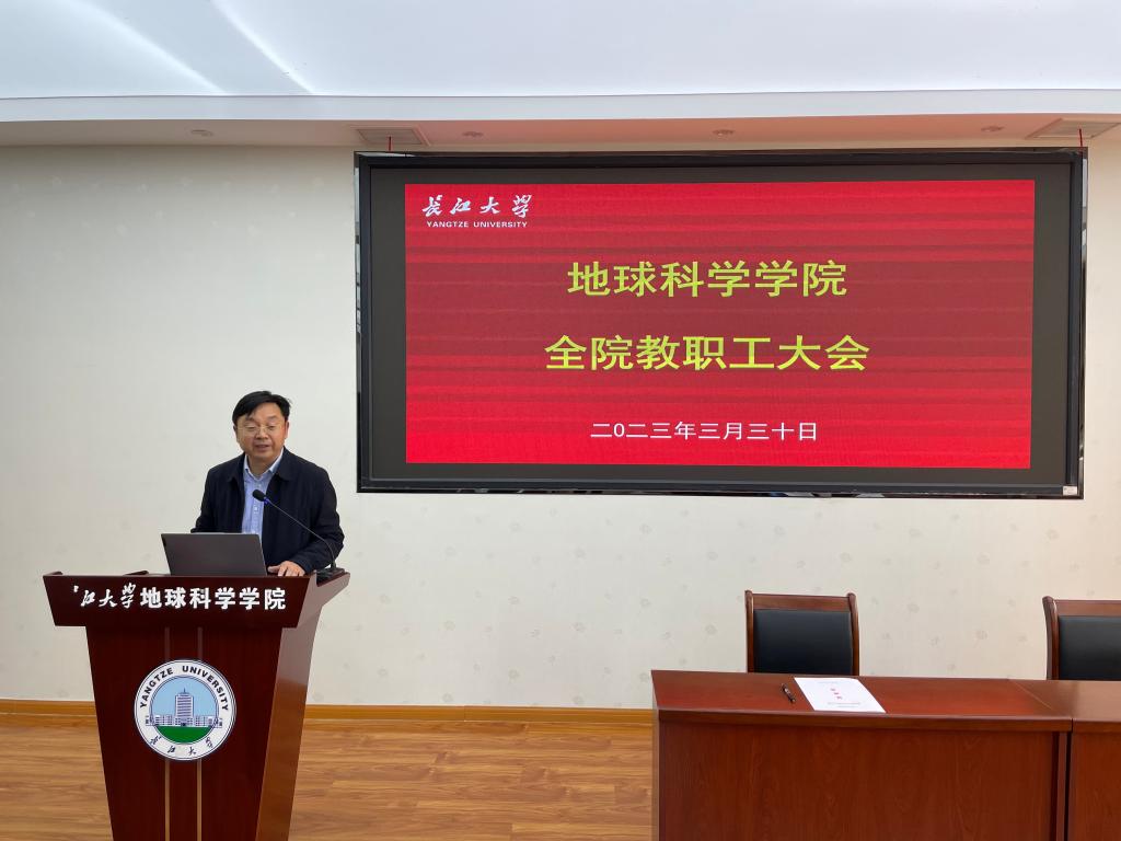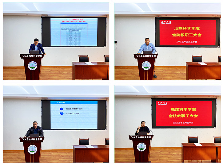 在石油科技大楼C301室召开了全院教职工大会。安排和部署学院近期重点工作,各系(中心)主任对2022年度工作完成情况进行述职,并签订2023年目标任务书,会议由院长胡明毅主持。