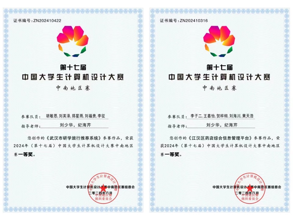 8名同学在刘少华老师的带领下前往济南决赛区-山东大学(威海校区)参加2024年(第17届)中国大学生计算机设计大赛(软件应用与开发)决赛。经过激烈的角逐,由崔海福老师指导的作品《基于多源数据的人群出行模式识别系统》和刘少华老师指导的作品《湖北省重大交通事故查询分析系统》获得中国大学生计算机设计大赛三等奖。
