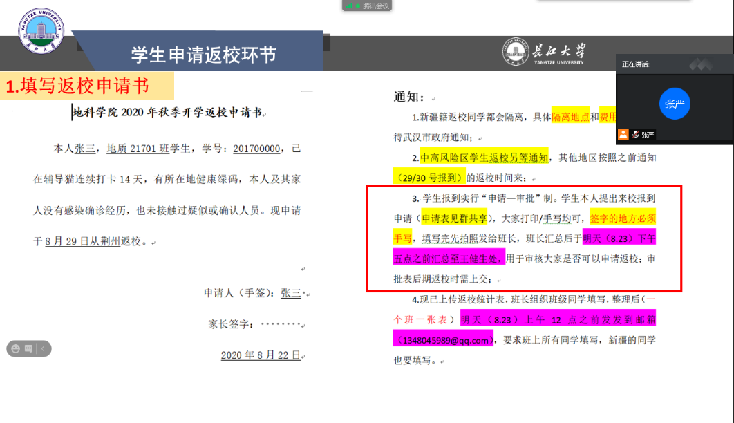 学工办全体老师召开线上会议,将学校开学方案进行了逐条解读,明确细节,责任到人;抓住开学工作重点及学生家长关心的要点,制作主题班会PPT;摸清全体学生返校行程安排,重点学生形成“一生一策”方案。