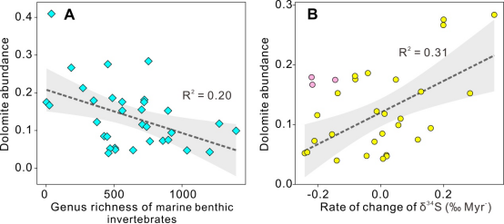 图1.(A)白云石含量与海洋底栖动物属种数量相关性图;(B)白云石含量与硫同位素变化相关性图。