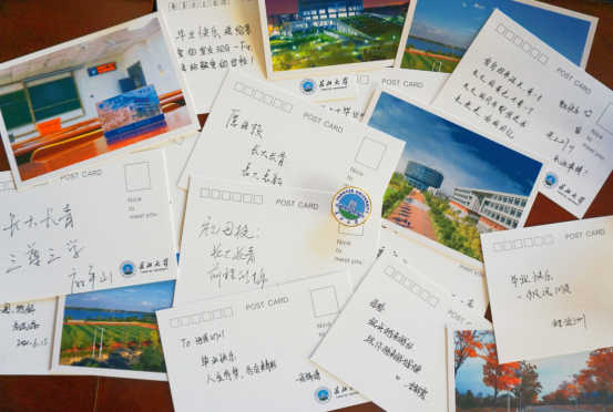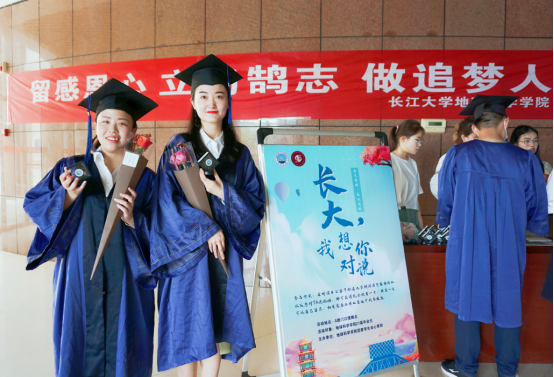 会场外,由学生会心育部同学布置了“长大我想对你说”毕业生感恩活动,一枚枚精致的校徽,一朵朵绽放的鲜花被精心包裹在礼盒中,更有印着校园景色的明信片,寄托着学院对毕业生“生如夏花,不负韶华”的殷殷期盼。同学们执笔一字一句的用深情告别美好,以祝福期许未来...现场弥漫着浓浓的毕业氛围。地质QX181班的杨文杰说:“想给导师一个深深地拥抱,但是太害羞了,现在可以送花给他,感谢他的谆谆教导”。