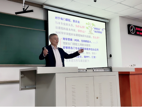 胡老师首先从学院和地质学的办学历史、师资力量、实践平台、人才培养及成效等方面做了详细介绍,他用大量图表,从地质学分类到主要专业课程、专业实习实践情况引发大家的兴趣,并深入浅出地就“地质学是什么、如何学好地质学、就业前景、毕业要求”,向新同学倾囊相授。