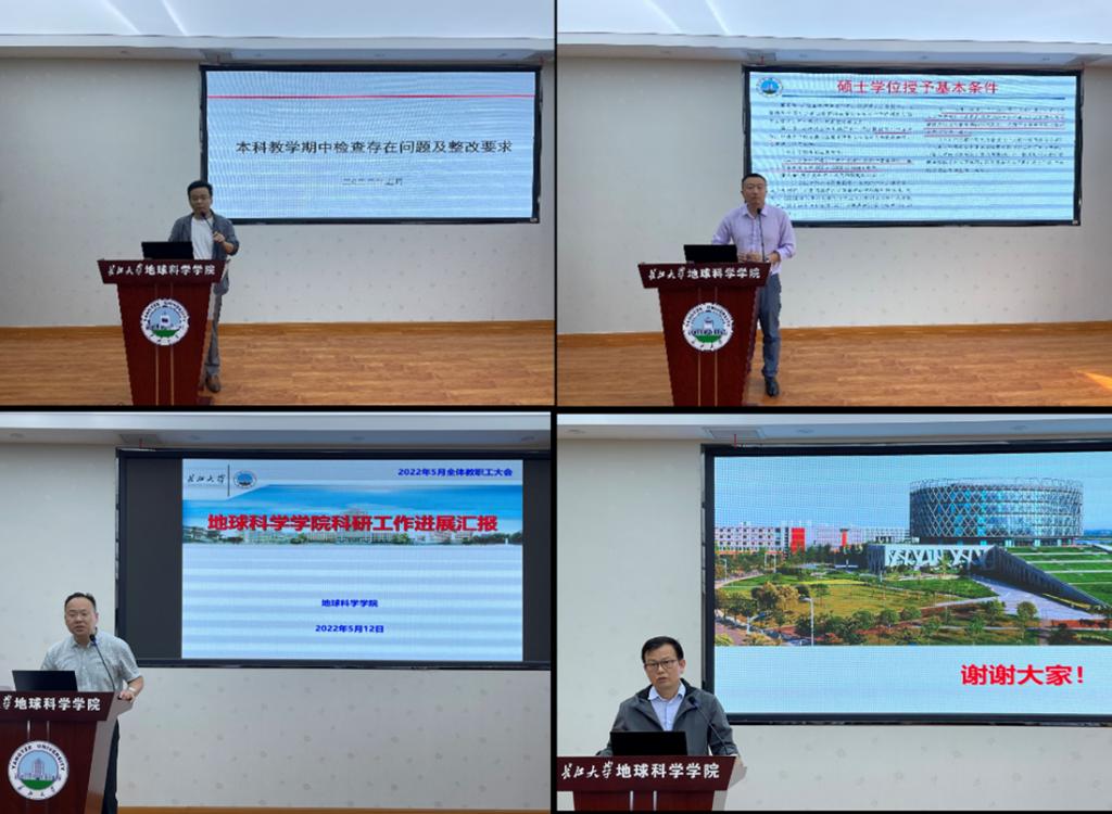 首先,学院各分管院领导通报和部署近期工作。副院长李强通报期中教学检查情况,并讲解2024年本科评估要求;副院长吴楠通报博士点申报进展和研究生毕业论文评审情况;副院长丁四兵传达武汉校区办学十周年成果展工作方案,并通报实验室安全检查结果;副院长韩登林介绍了国际古地理学会议筹备情况。