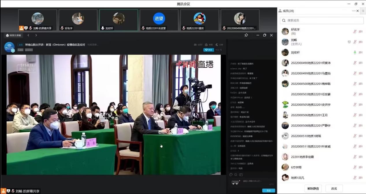 各年级共1900名学生通过腾讯会议等方式集体学习钟南山院士给全国高校学生上的《新冠(Omicron)疫情动态及应对》科学防疫大课。