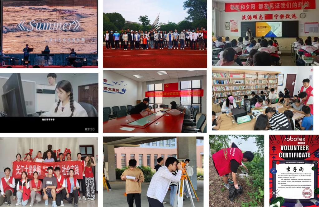 第五次学生代表大会、参与20年校庆视频拍摄、办公室卫生打扫、校园清扫、暑期三下乡社会实践、担任第23赛季Robotex湖北省赛区武汉站的志愿者、2023级新生迎新、受邀给全体地科院同学进行暑期社会实践宣讲等。