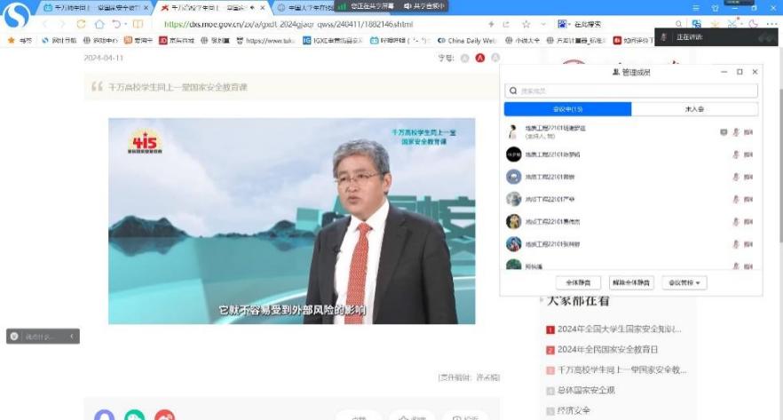 4月14日下午三时,各班通过线下线上相结合的方式,由各班班长带领同学们集中观看了“千万高校学生同上一堂国家安全教育课”主题直播公开课。视频从政治安全、国土安全、军事安全、经济安全、文化安全、社会安全、网络安全等七个方面向同学们普及了国家安全的相关内容,引导大家深刻理解国家安全的重要性,积极践行总体国家安全观。