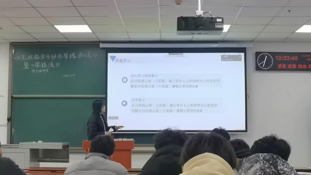 辅导员姚佳老师围绕《中华人民共和国学位法》,从授予条件、审查程序、动态监督三大模块展开深度解读。姚佳老师结合典型案例,阐释了《学位法》里面的具体实施细节。例如,在授予条件方面,申请人必须政治立场正确、学业成绩达标、体质健康合格且具备实践能力。在审查程序方面,学生提交完整材料后,学位授予单位需在60日内完成初审并反馈,之后再由校学位评定委员会组织审查,通过票决制来确定授予名单,以此保障程序透明公正。在动态监督方面,明确规定一旦查实论文代写、剽窃、伪造等行为,将不予授予学位,已授予的学位也将撤销并公告失效,若学生对学位授予结果有异议,可通过复核、申诉等法定途径维权。