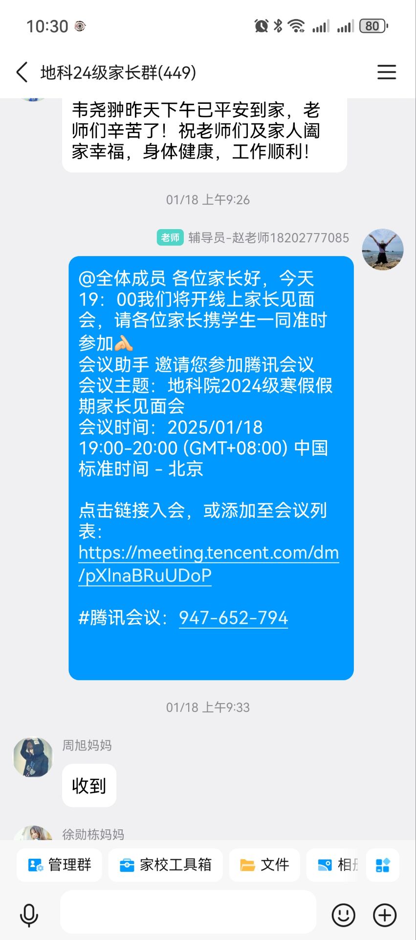 于1月18日晚7点,24级本科生辅导员赵娥老师通过腾讯会议的形式,组织召开了2024年秋季学期未线上家长会。会议围绕上学期工作总结、假期安全提示与新学期展望三个方面展开,重点强调了“家校协同育人”的重要性。