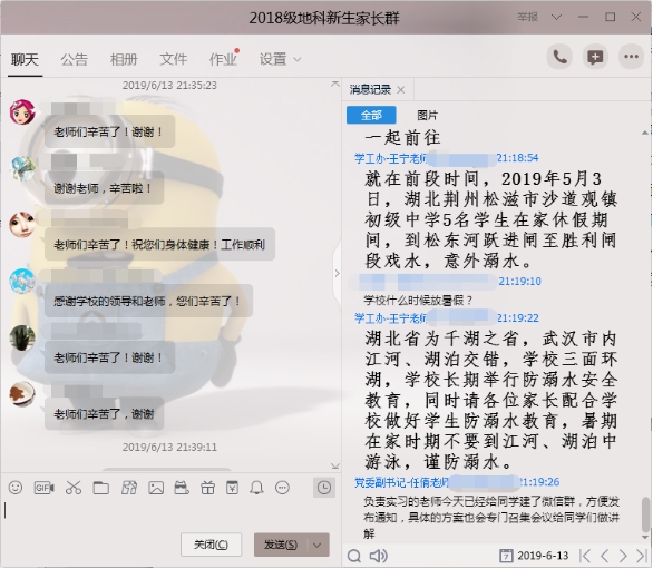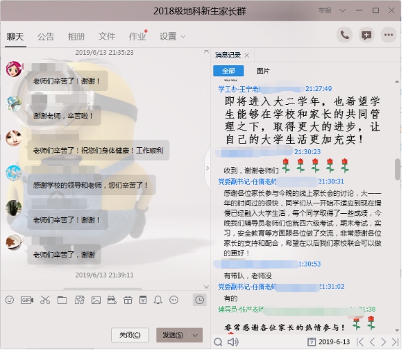 在“2018级地科新生家长群”中召开了主题为“诚信应考,平安一夏”2018级本科生第三次线上家长会,学院党委副书记任倩、辅导员潘志远、张严以及学生家长共计140余人参与了讨论,家长会由年级辅导员王宁主持。